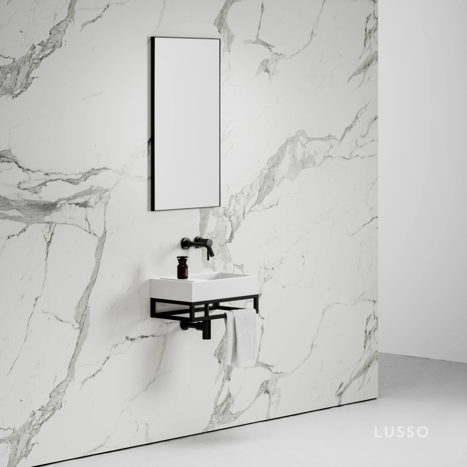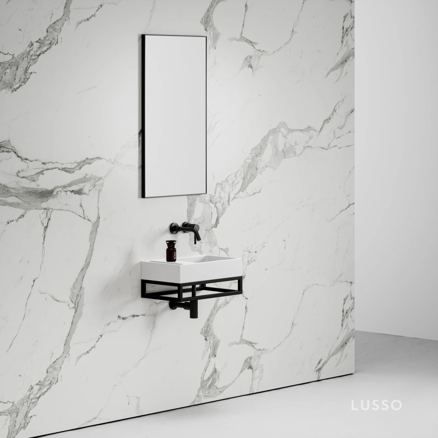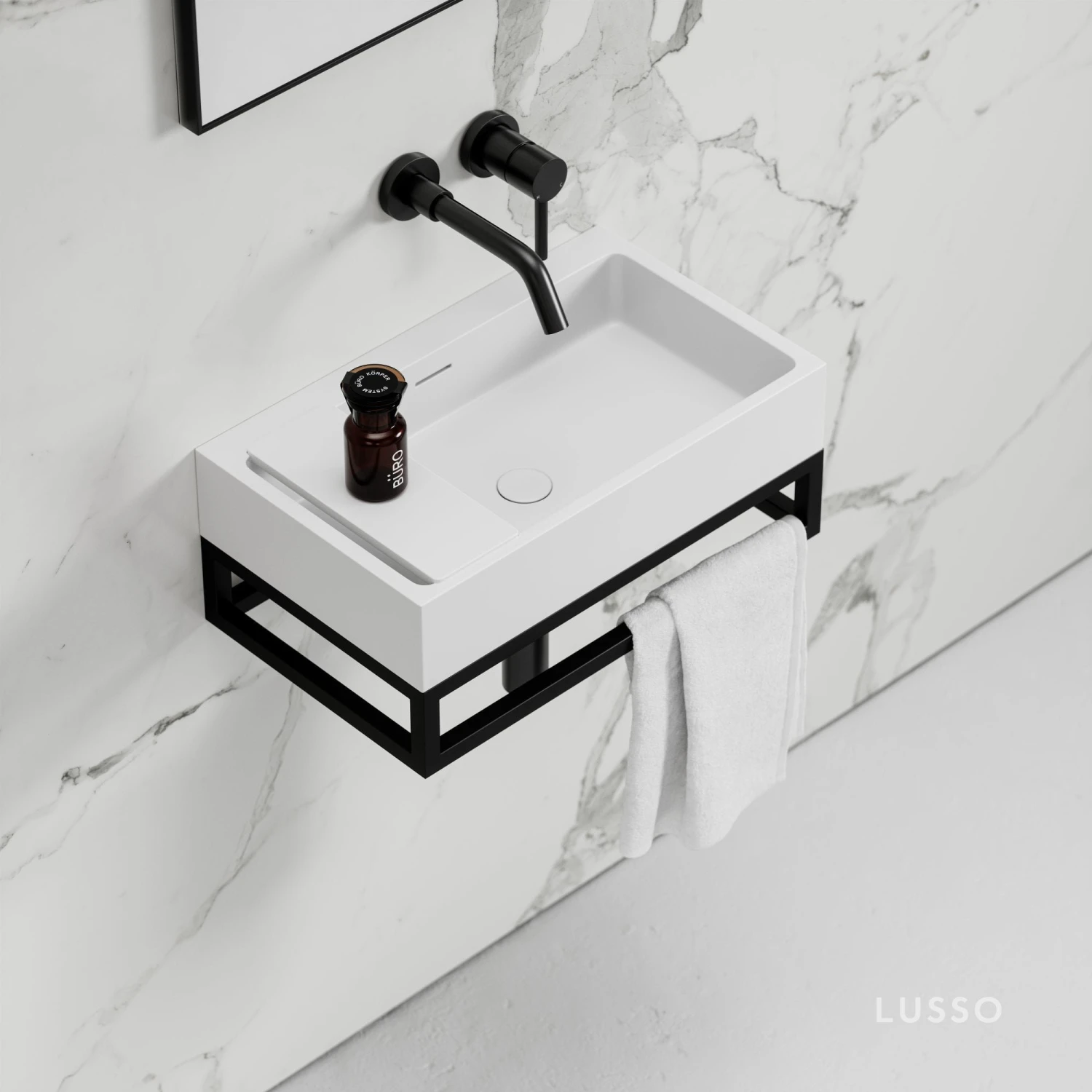 The Lusso Ciro Matte Black Framed Freestanding Vanity Unit (with stone basin included) is stunning and functional in equal measure. The sophisticated Wall Hung Vanity Unit is the perfect accompaniment to any of our Lusso Luxe series taps and accessories, and it will complete your bathroom in a perfect minimalist style. Everything about this cloakroom vanity unit is designed to give you years of beauty and practicality all in one.