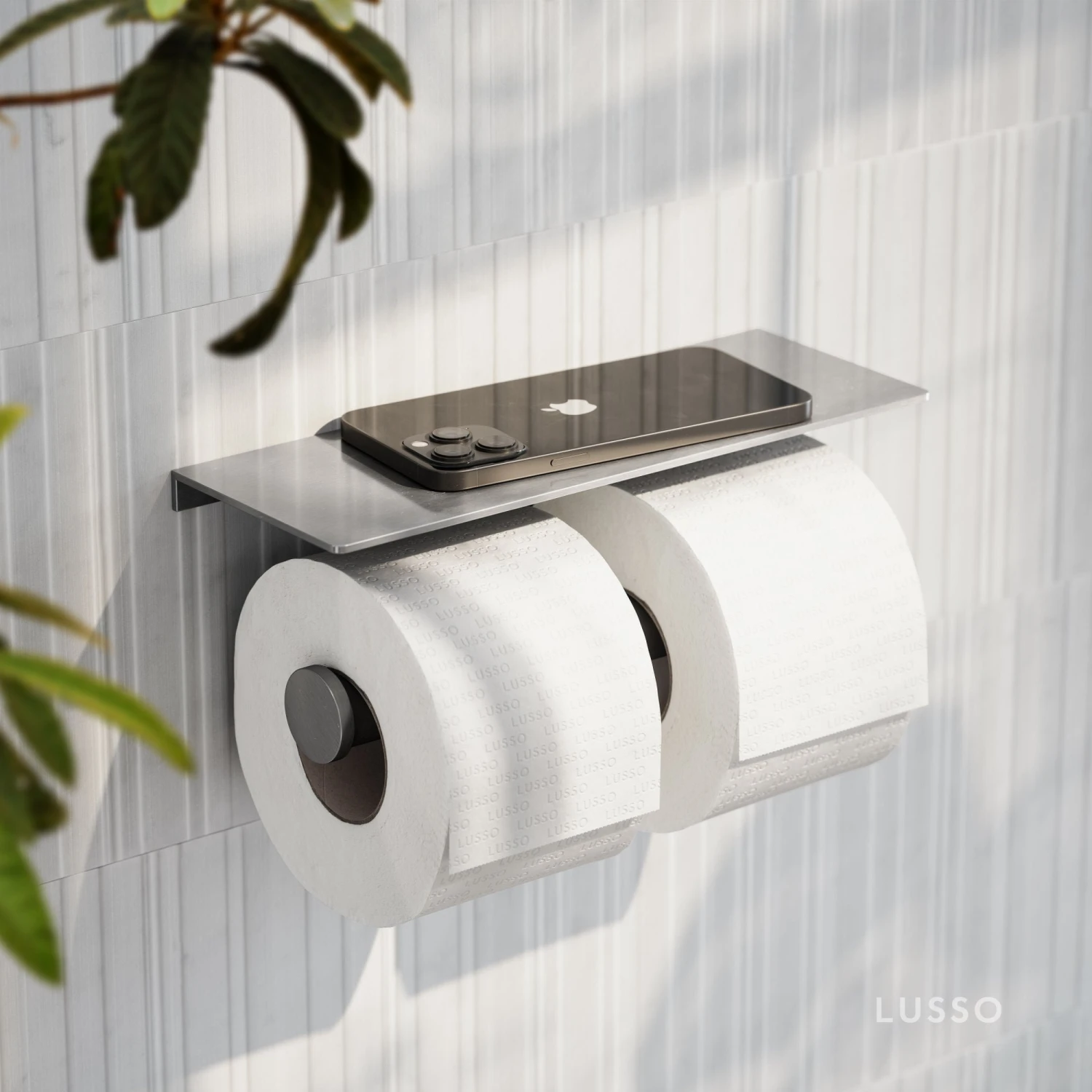 Boasting our brushed stainless finish, the toilet roll holder contains a double design for two toilet rolls as well as an integrated shelf, allowing you to decorate with your favourite decorative items, be it a candle, a diffuser or simply for placing your phone.