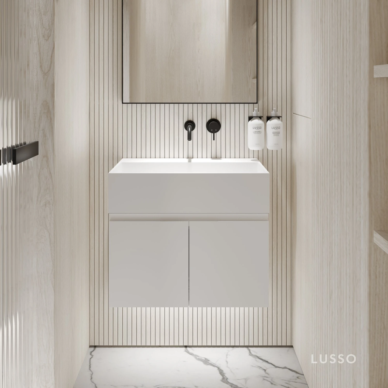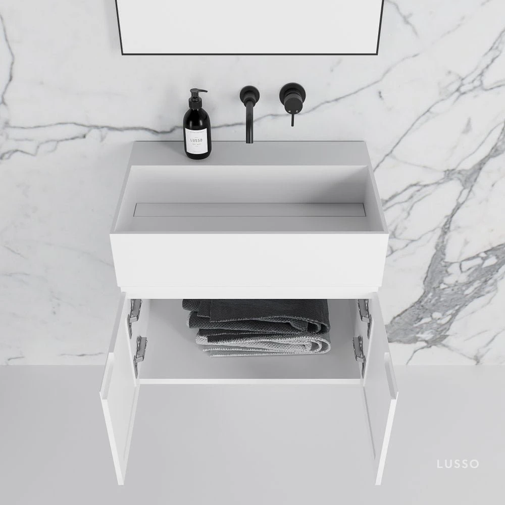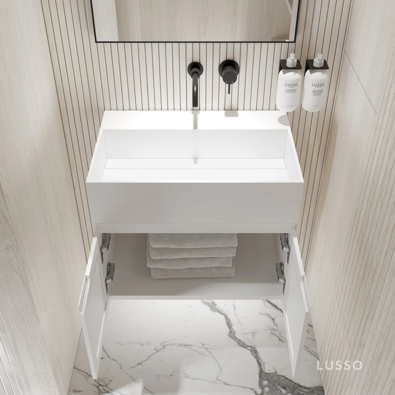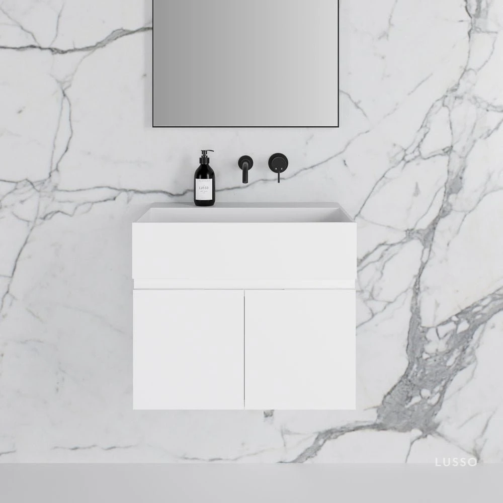 Offering a sense of beauty and sophistication, the Lusso Ethos Wall Hung Bathroom Vanity Unit (with stone basin included) sets a distinctly modern tone in your space. With clean, sleek lines that encompass a generous basin, the Ethos fuses innovation, craftsmanship and signature Lusso design. Featuring two soft-close doors that hide ample storage space for bathroom luxuries, the Ethos Matte White Vanity Unit blends function and form in a truly remarkable style.