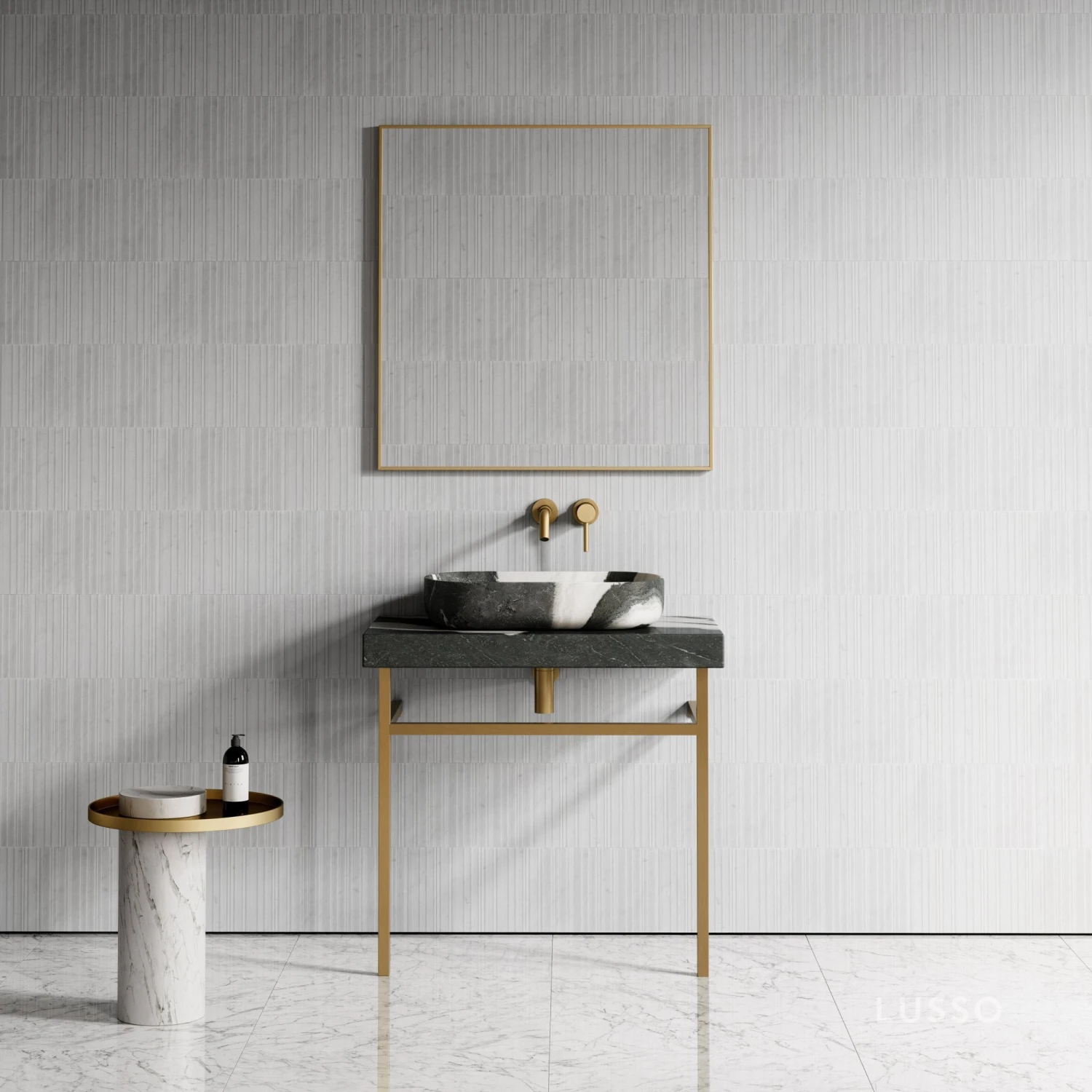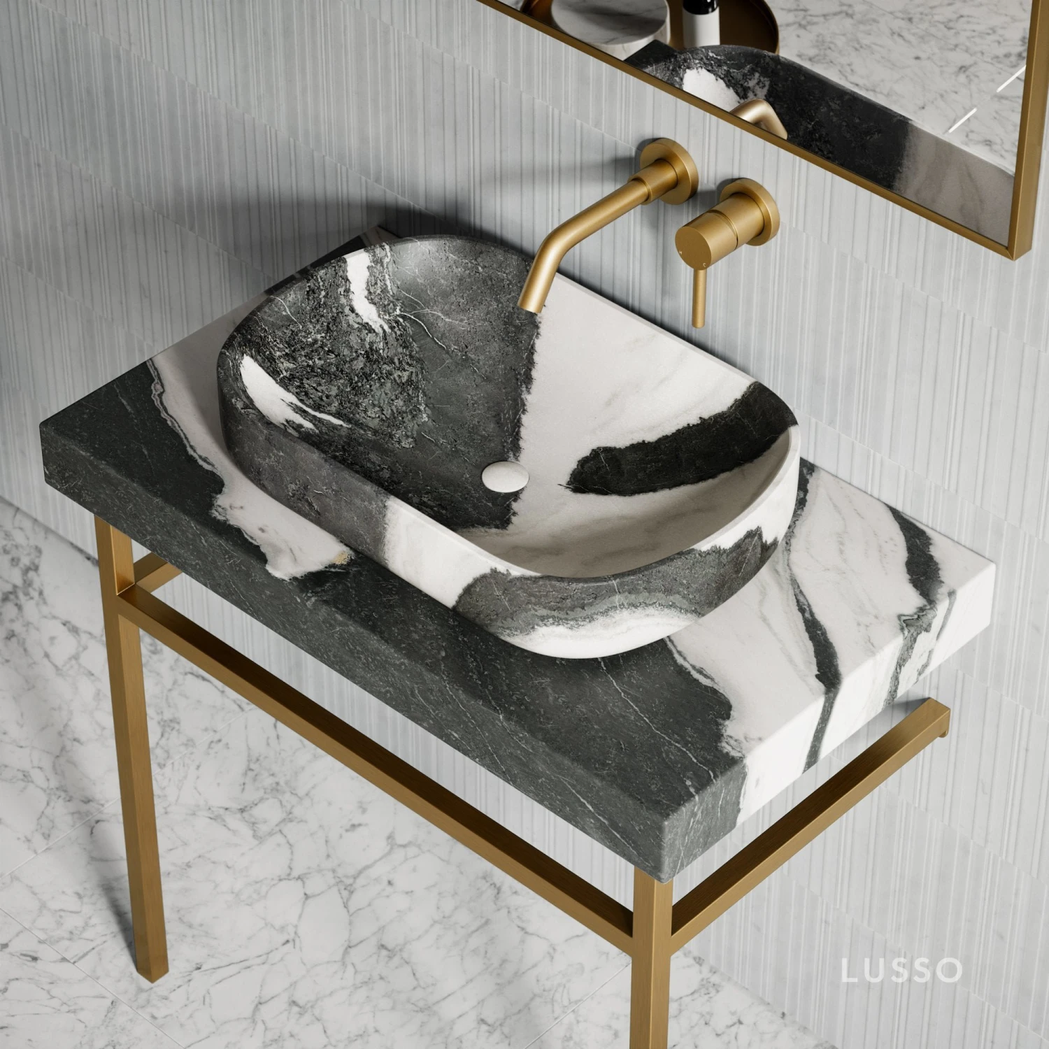 Displaying brushed gold legs and a striking countertop crafted from the distinct Panda marble, the vanity offers timeless appeal and glamour. Pair your vanity unit with a Panda marble countertop basin such as the Designo or take the theme further and complete with our Panda basin taps from the Lusso Porto range.