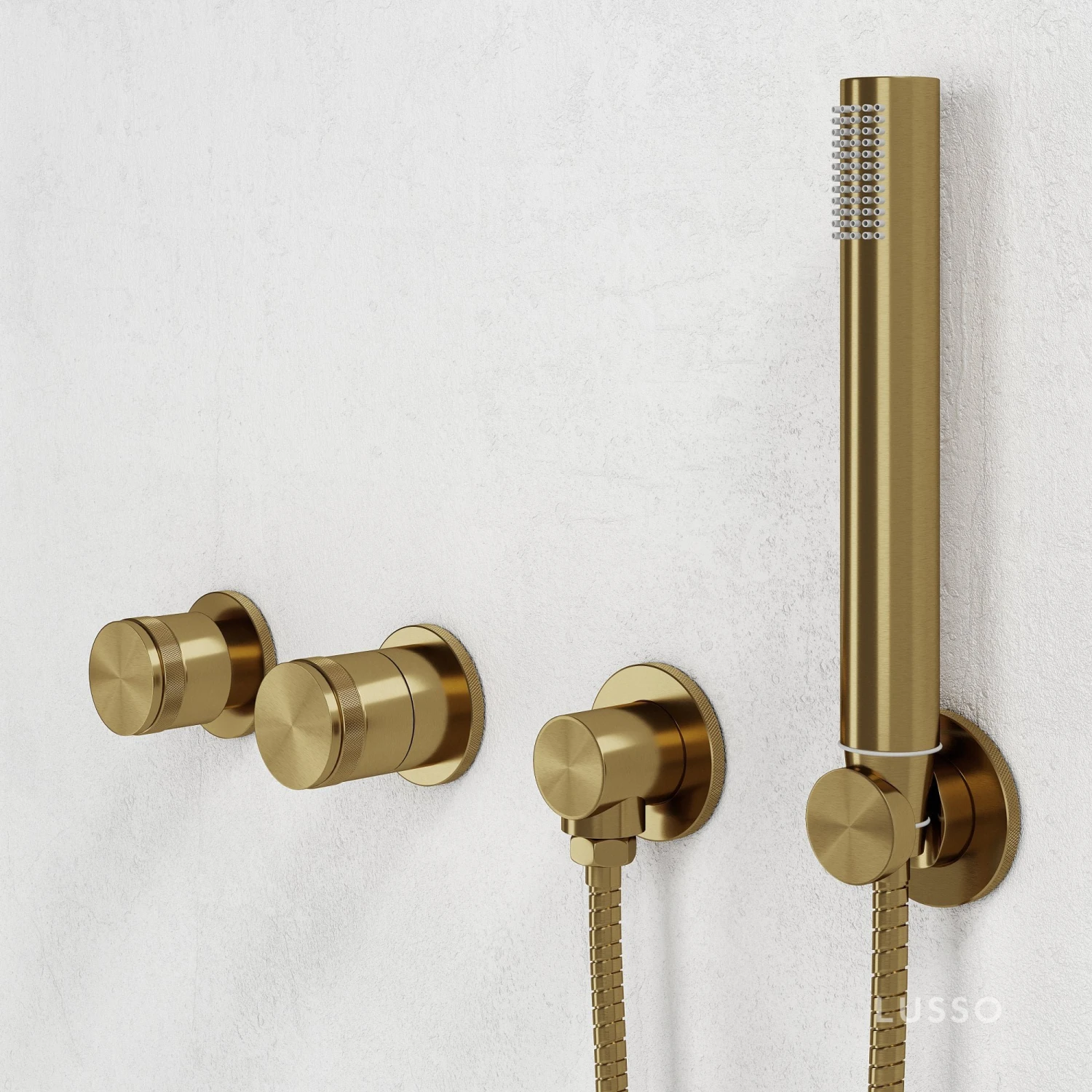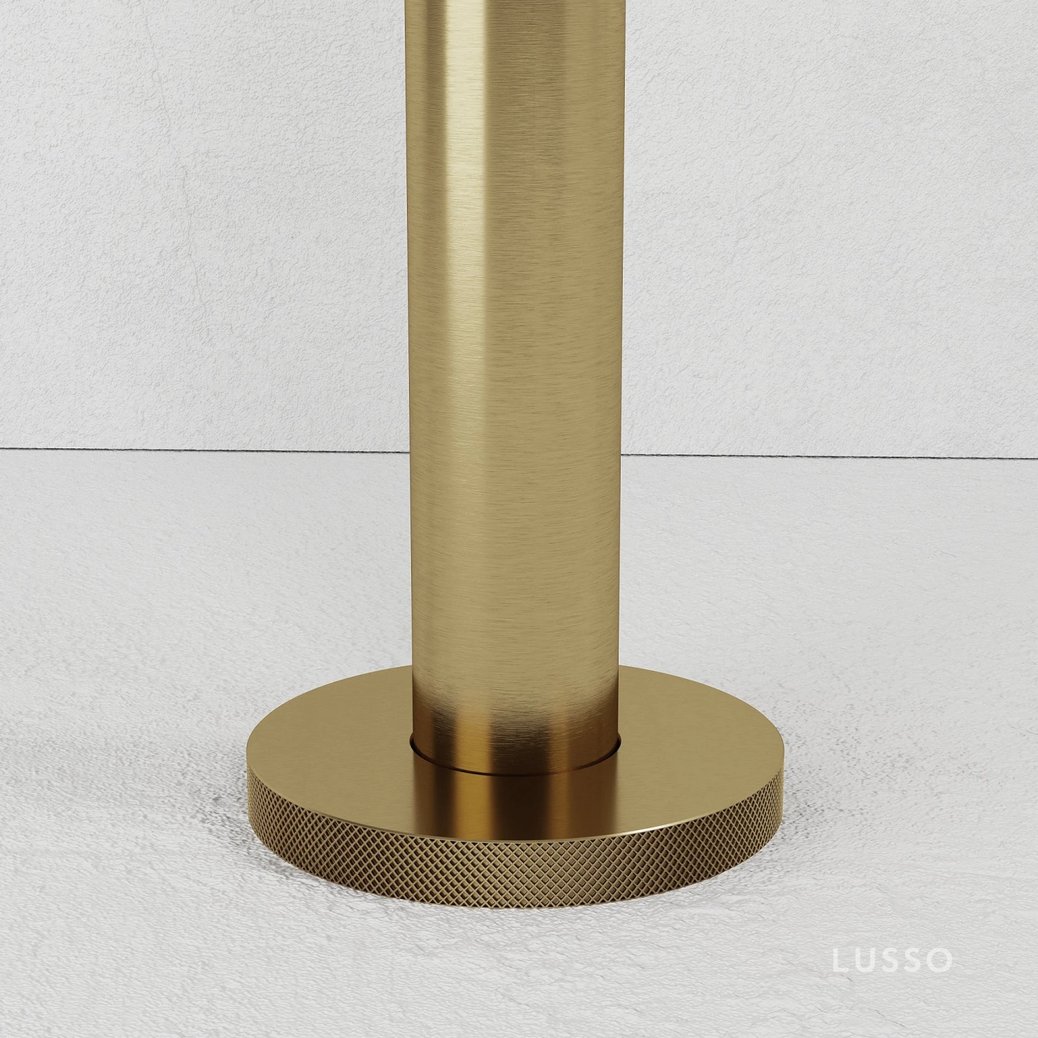 As well as a deck mounted bath tap with a sleek, elongated neck, it features a wall mounted, handheld shower and tap handles finished with distinctive knurled engraving – a diamond patterning found within the interiors of some of the world’s most coveted motorcars. With our signature brushed gold finish, the mixer tap enhances the look and feel of any luxury bathroom, and works cohesively with our wider collection of brushed gold brassware and accessories.