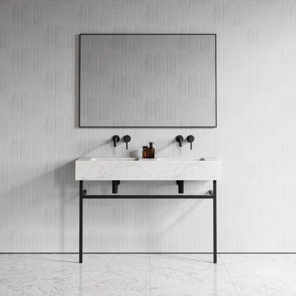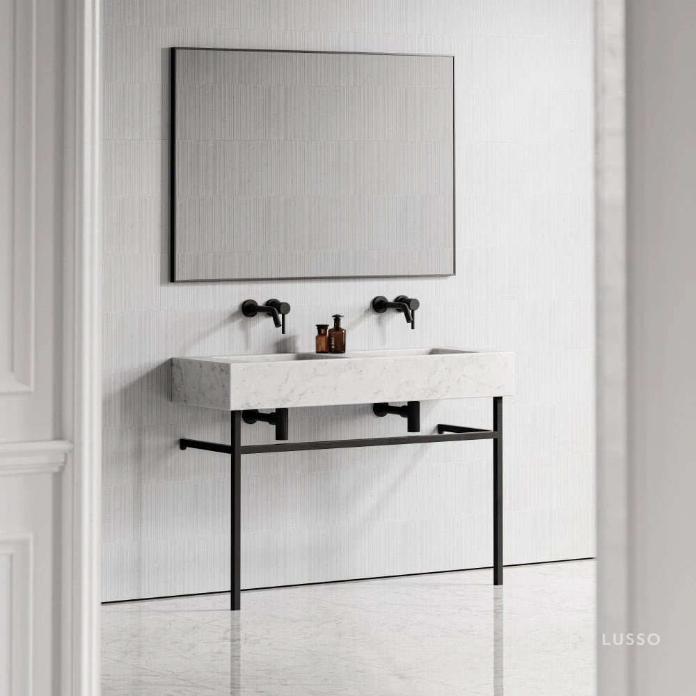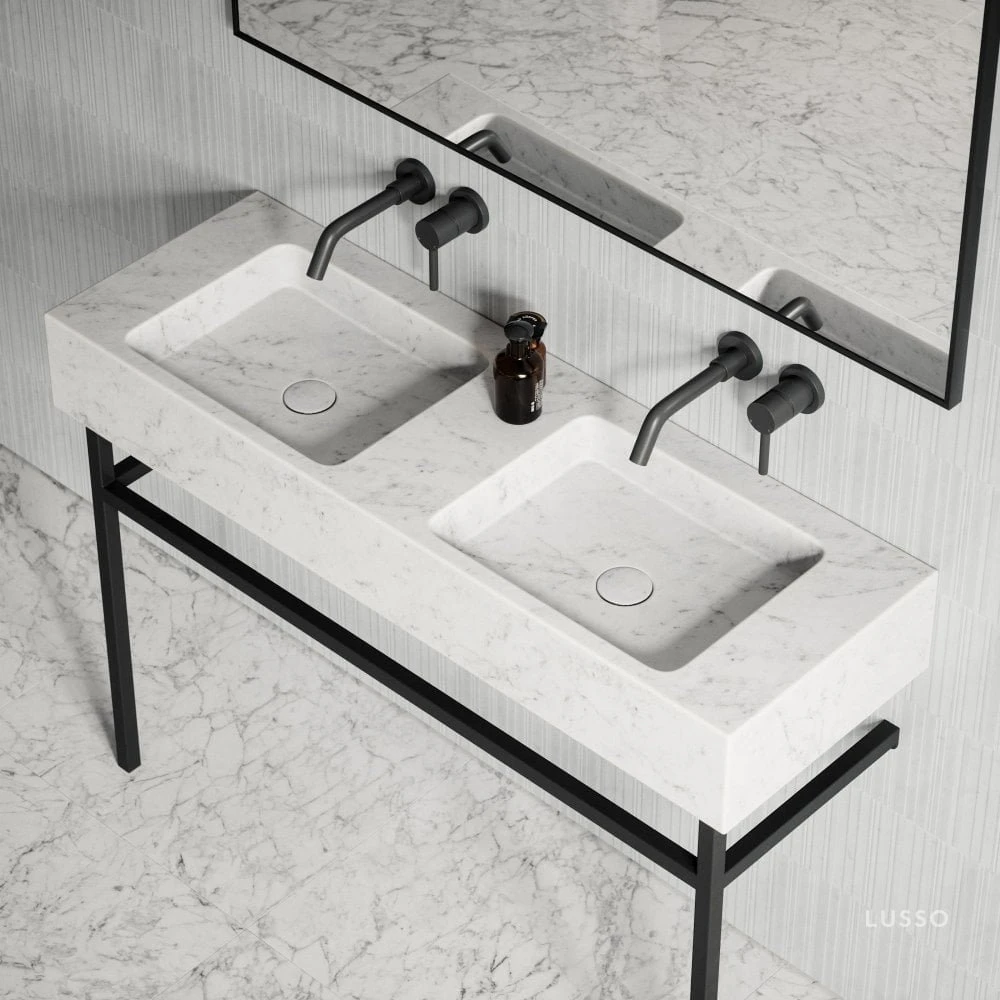 A consciously designed double vanity unit, the charismatic double basins seamlessly sit a-top a weightless stainless steel structure. With a combination of smooth honed curves, serene surface of marble, and soft satin legs; the double Vernante is a truly enriching piece which strives to incorporate stylish practical everyday use.