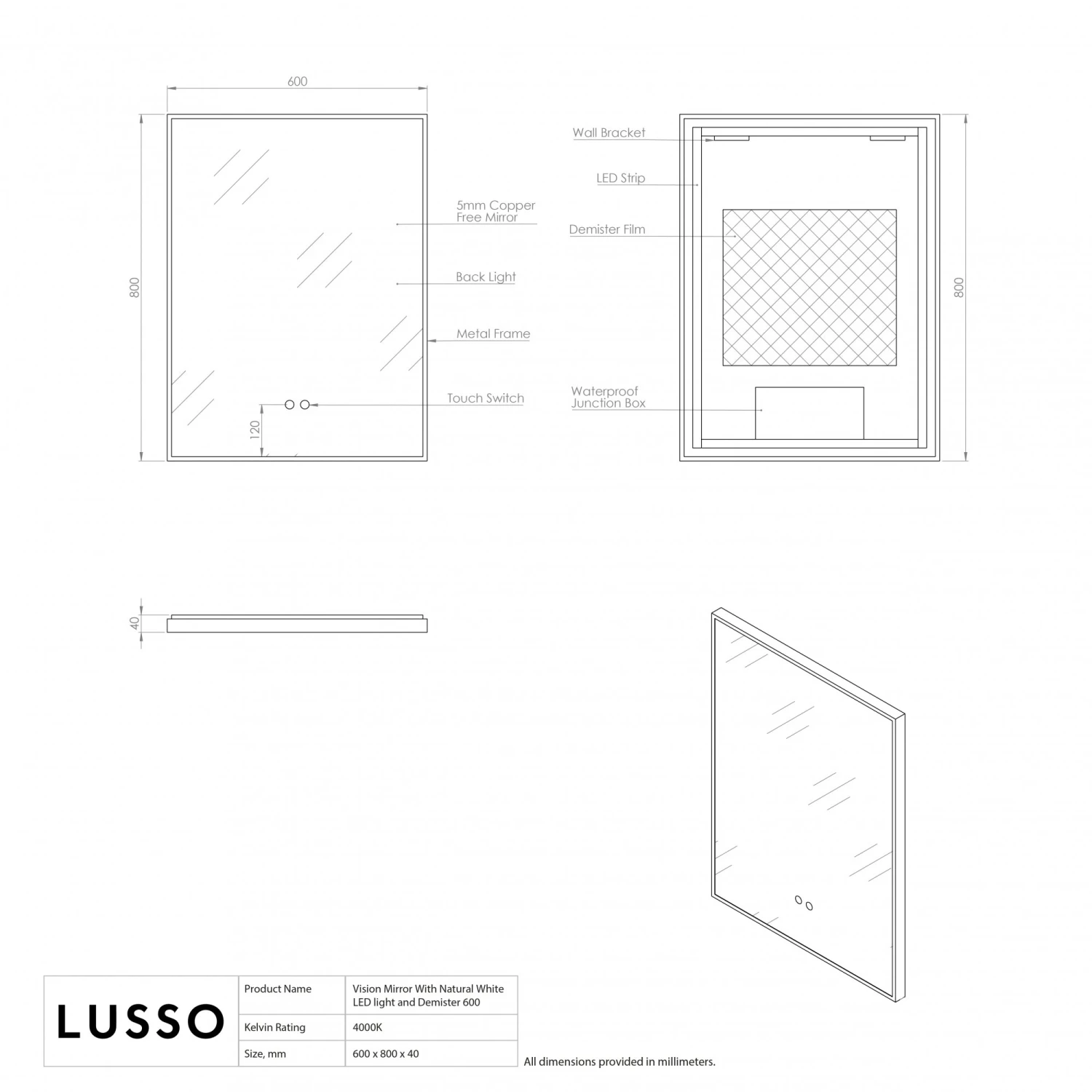 The Vision LED Mirror is a back lit, slimline design, with a width of 600mm, that looks beautiful in modern interiors.