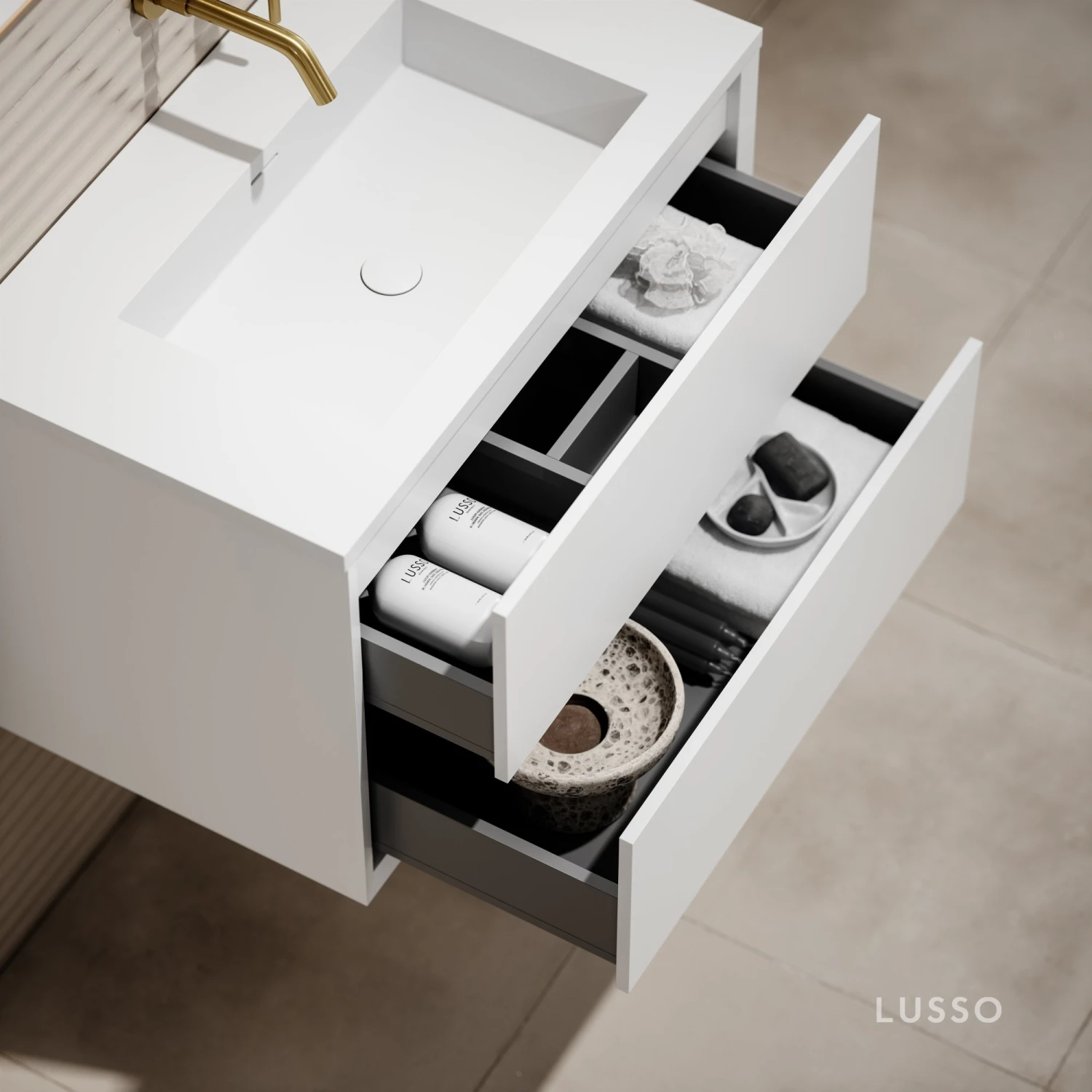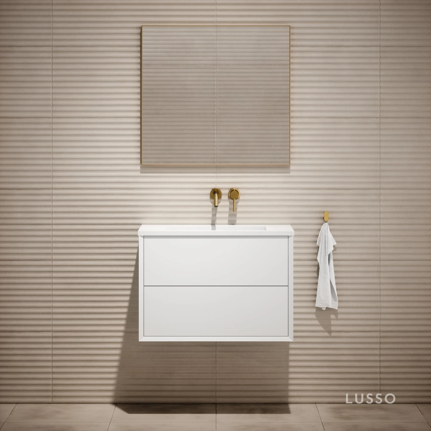 The effortlessly stylish design of the Lusso Volini Matte White 800mm Vanity Unit (with stone basin included) adopts two of the most coveted interior trends, a contemporary matte finish and elegant minimalistic storage. Incorporating a signature Lusso basin, the Volini Matte White Vanity Unit transforms any space into a luxury haven. Combining our ethos of exclusively using the highest quality materials with a sophisticated design, this wall hung vanity unit makes a stylish statement in any space.
