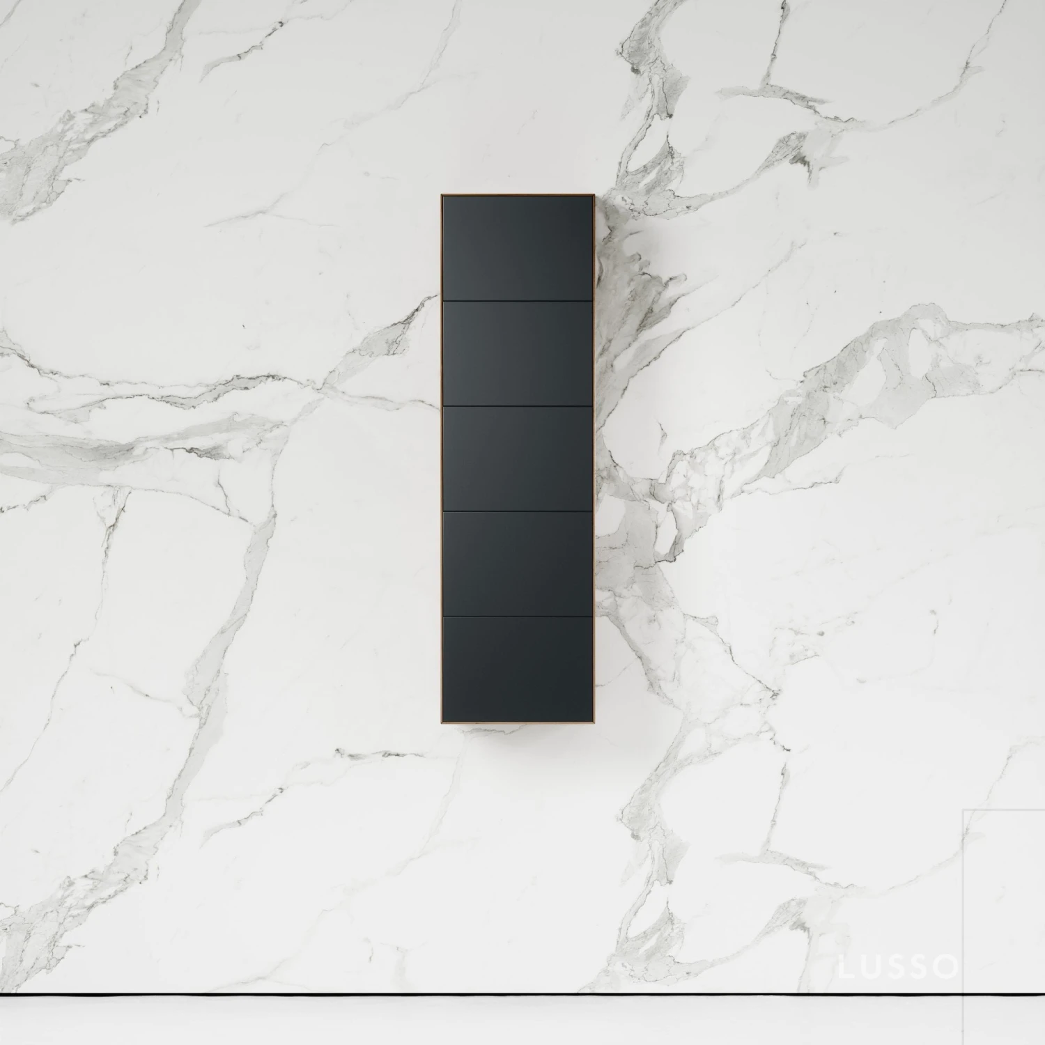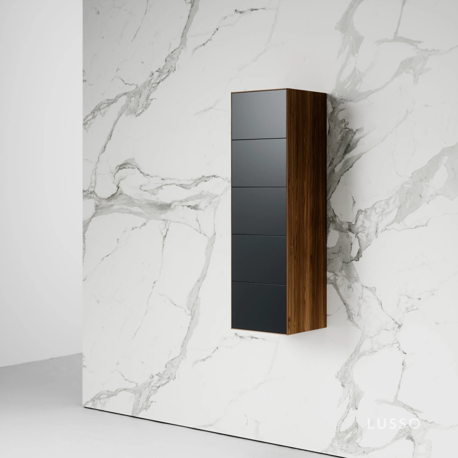 Elevate your bathroom storage with the beautifully crafted Lusso Zotto Wall Hung Cabinet. The wall hung cabinet showcases a beautiful blend of American walnut and black anthracite, finished with a subtle blue undertone. Combining classic style with contemporary craftsmanship, the Zotto is the epitome of decadent glamour. With five storage drawers, this cabinet is a stunning example of minimalist elegance and works perfectly with an array of Lusso bathroom products. Add beauty and sophistication to your interiors with luxury storage designed to elevate your home.